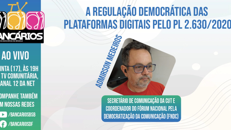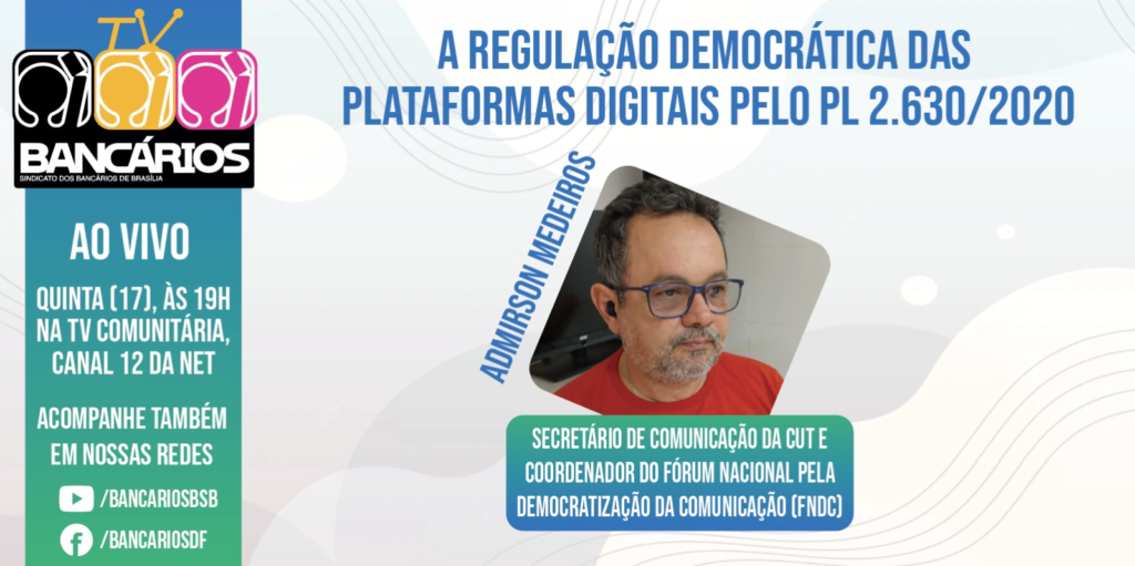 O TV Bancários que vai ao ar nesta quinta-feira (17) tem como tema “A regulação democrática das plataformas digitais pelo Projeto de Lei 2.630/2020, que propõe a Lei Brasileira de Liberdade, Responsabilidade e Transparência na Internet”. O convidado do programa é Admirson Medeiros (Greg), secretário de Comunicação da CUT, coordenador do Fórum Nacional pela Democratização da Comunicação (FNDC) e membro do Conselho Nacional de Direitos Humanos.