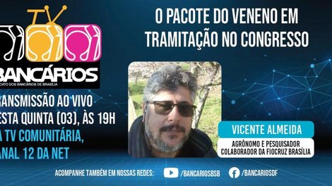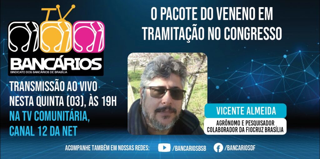 O convidado do TV Bancários para discutir o Pacote do Veneno é o agrônomo Vicente Almeida, mestre em Planejamento e Gestão Ambiental e doutorando em Desenvolvimento, Território e Sociedades. Atualmente, Vicente é pesquisador colaborador da Fiocruz Brasília, onde coordena projetos analisando a dinâmica do uso de agrotóxicos no DF e seus impactos na saúde ambiental da população. Foi pesquisador em Impactos Ambientais da Embrapa entre 2005 e 2020.