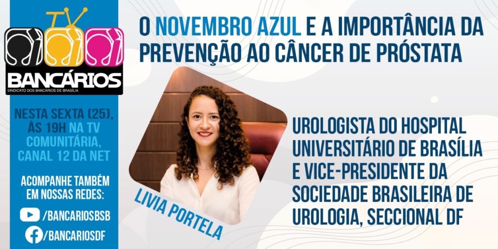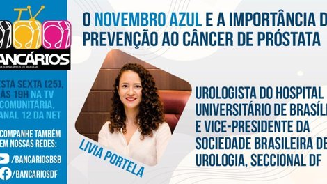 O TV Bancários vai ao ar nesta sexta-feira (25) com o tema Novembro Azul, campanha de prevenção ao câncer de próstata. A convidada do programa é a médica Livia Portela, urologista do Hospital Universitário de Brasília e vice-presidente da Sociedade Brasileira de Urologia (SBU), seccional DF.