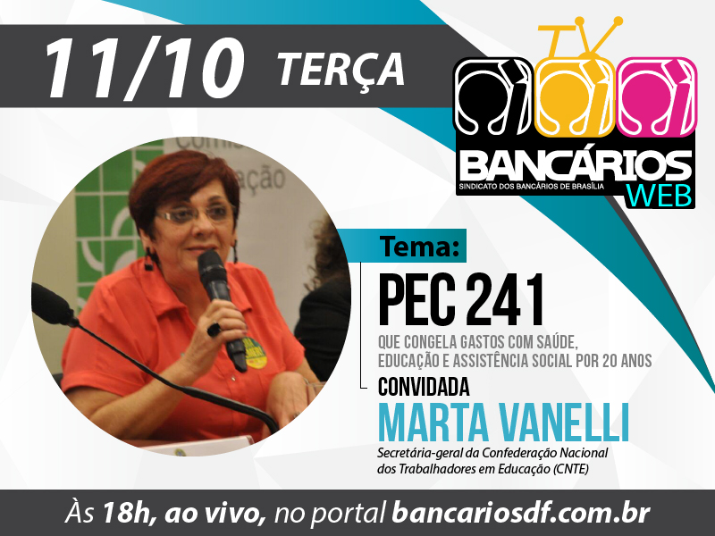 O Congresso Nacional começa a votar, nesta semana, a Proposta de Emenda à Constituição PEC 241/16, que congela gastos com saúde, educação e assistência social por 20 anos. Para falar sobre o assunto, o programa TV Bancários Web receberá, nesta terça (11), Marta Vanelli, secretária-geral da Confederação Nacional dos Trabalhadores em Educação (CNTE). O programa será exibido às 18h.