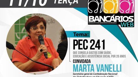 O Congresso Nacional começa a votar, nesta semana, a Proposta de Emenda à Constituição PEC 241/16, que congela gastos com saúde, educação e assistência social por 20 anos. Para falar sobre o assunto, o programa TV Bancários Web receberá, nesta terça (11), Marta Vanelli, secretária-geral da Confederação Nacional dos Trabalhadores em Educação (CNTE). O programa será exibido às 18h.