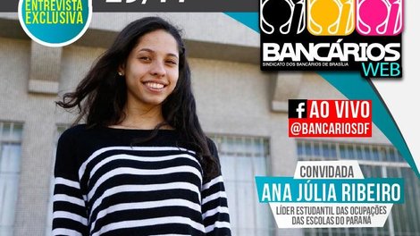 O programa TV Bancários Web desta terça-feira (29) recebe a estudante paranaense Ana Júlia Ribeiro, 16 anos, representante do movimento secundarista responsável pela ocupação de centenas de escolas no Paraná. O programa será exibido ao vivo, a partir das 14h30, pelo portal do Sindicato e pelas redes sociais da entidade.