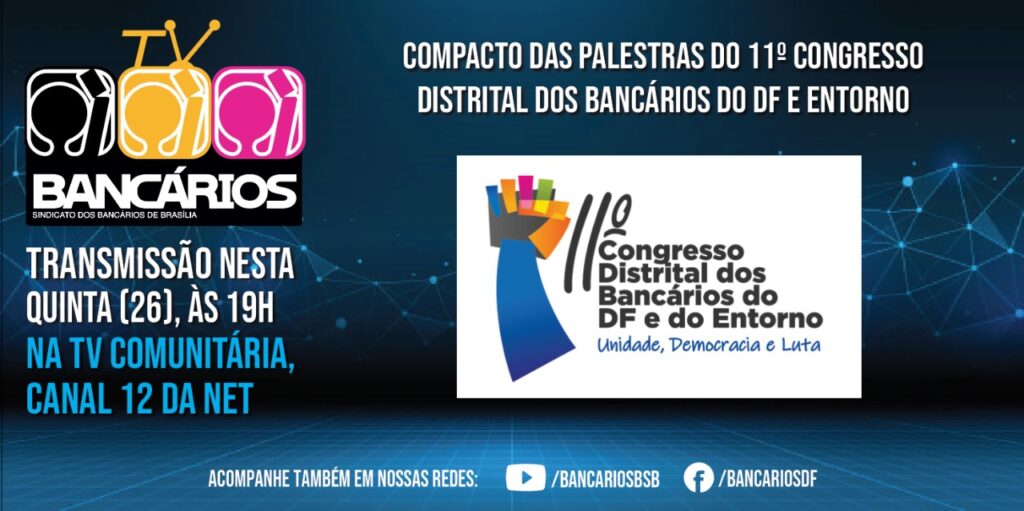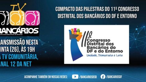 A TV Bancários na TV Comunitária desta quinta-feira (26) exibe um compacto das palestras ministradas durante o 11º Congresso Distrital dos Bancários do DF e Entorno, realizado nos dias 20 e 21, na LBV.