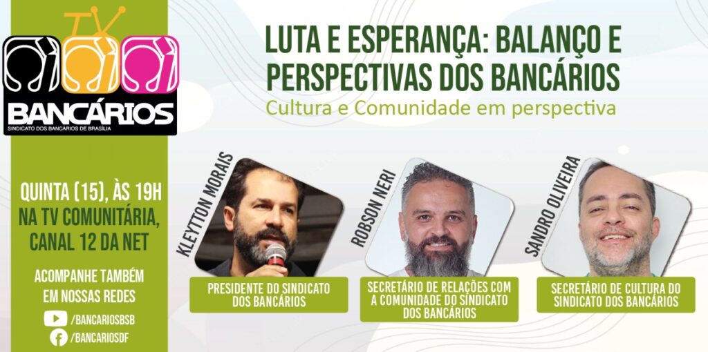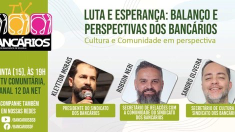 O programa TV Bancários vai ao ar às 19h, pelo canal 12 da Net e pelas redes sociais do Sindicato. Acompanhe!