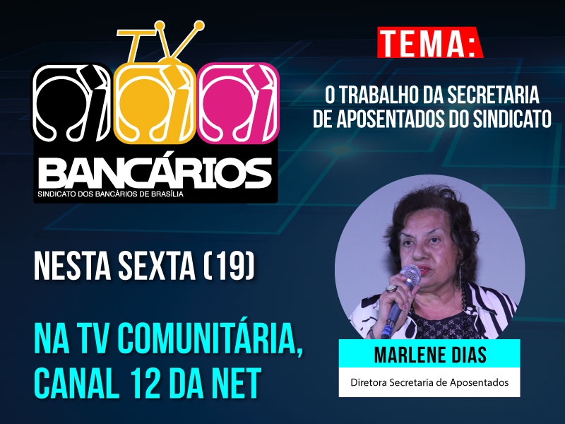 O TV Bancários na TV Comunitária desta sexta (19) vai falar sobre o trabalho da Secretaria de Aposentados do Sindicato em prol desse segmento. Como convidada, esta edição do programa recebe Marlene Dias, diretora da pasta e presidente da Associação dos Economiários Aposentados de Brasília (AEA/DF).