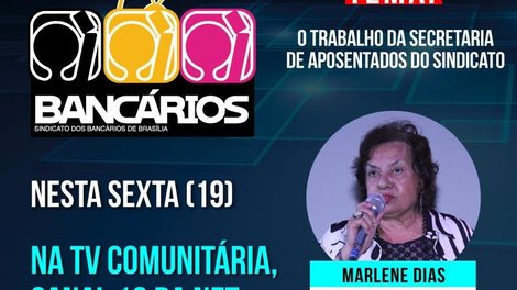 O TV Bancários na TV Comunitária desta sexta (19) vai falar sobre o trabalho da Secretaria de Aposentados do Sindicato em prol desse segmento. Como convidada, esta edição do programa recebe Marlene Dias, diretora da pasta e presidente da Associação dos Economiários Aposentados de Brasília (AEA/DF).