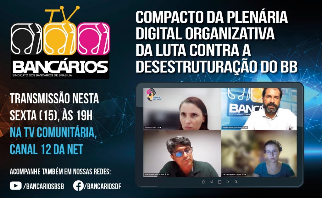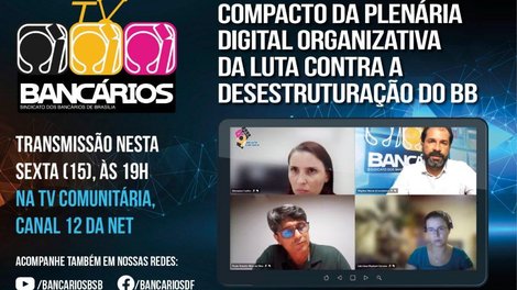 A edição desta semana do TV Bancários na TV Comunitária, que será exibida excepcionalmente nesta sexta-feira (15), traz um compacto da plenária digital promovida pelo Sindicato que teve como objetivo debater estratégias de luta e resistência contra os efeitos perversos da desestruturação do Banco do Brasil.