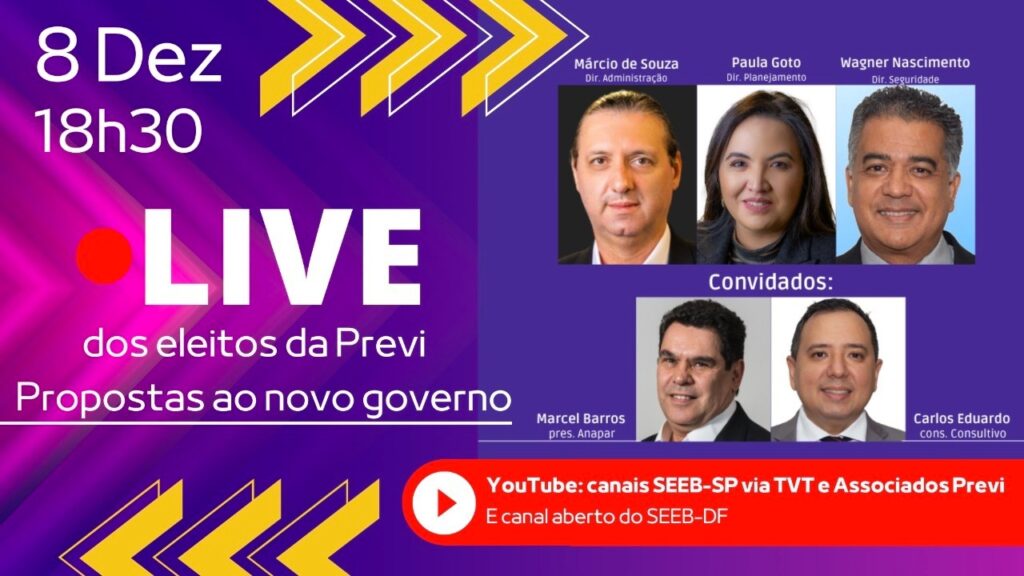Participam da live a diretora de Planejamento, Paula Goto, o diretor de Seguridade, Wagner Nascimento, e o diretor de Administração, Márcio de Souza. Como convidados, participam o presidente da Associação Nacional dos Participantes de Fundos de Pensão e dos Beneficiários de Saúde Suplementar de Autogestão (Anapar), Marcel Barros, e o conselheiro consultivo da Previ, Carlos Eduardo.