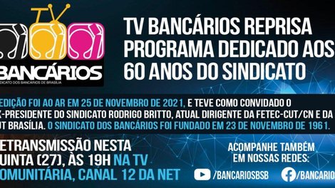A edição do TV Bancários dedicada ao aniversário de 60 anos do Sindicato será reprisada nesta quinta-feira (27). O programa teve como convidado o ex-presidente do Sindicato Rodrigo Britto, atual dirigente da Fetec-CUT Centro Norte e da CUT Brasília.