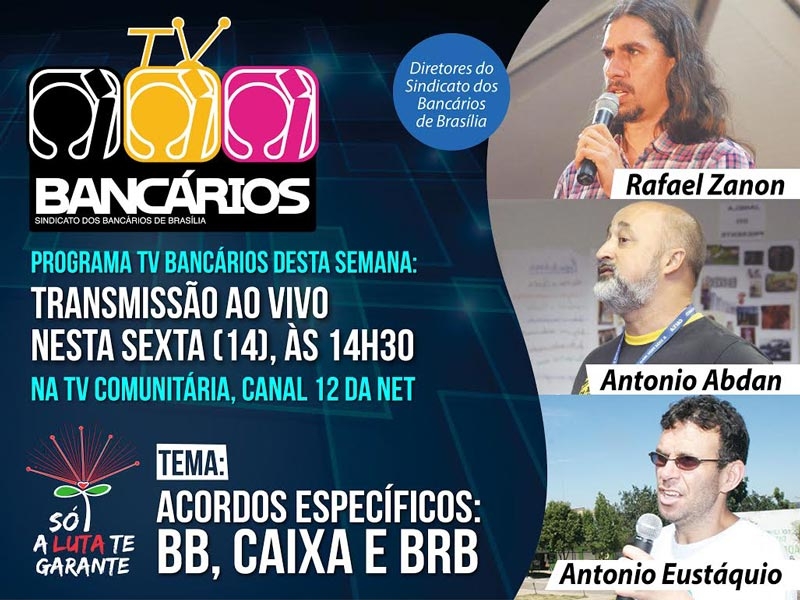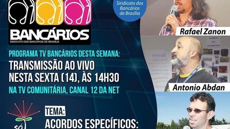 O programa TV Bancários desta sexta (14) tem como tema os acordos específicos da Campanha Nacional 2016 do Banco do Brasil, da Caixa Econômica Federal e do BRB. Para falar sobre o assunto, os convidados são os diretores do Sindicato Rafael Zanon, Antonio Abdan e Cristiano Severo.