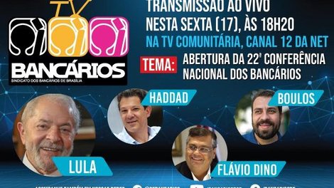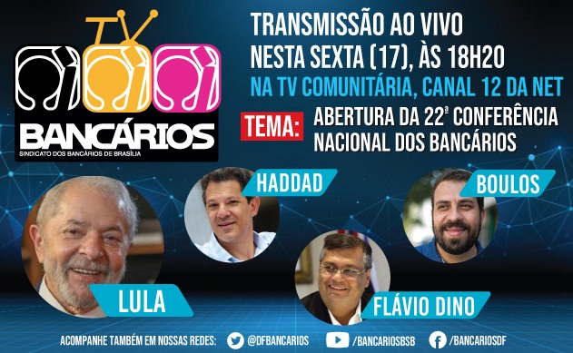 A partir das 18h desta sexta-feira (17), bancários e bancárias de todo o país acompanharão a abertura da 22ª Conferência Nacional dos Bancários que, pela primeira vez, será realizada em plataforma online. O TV Bancários na TV Comunitária vai transmitir o evento que faz parte da Campanha Nacional 2020 da categoria pela TV Comunitária de Brasília (canal 12 da Net) e pela página do Sindicato no Facebook.