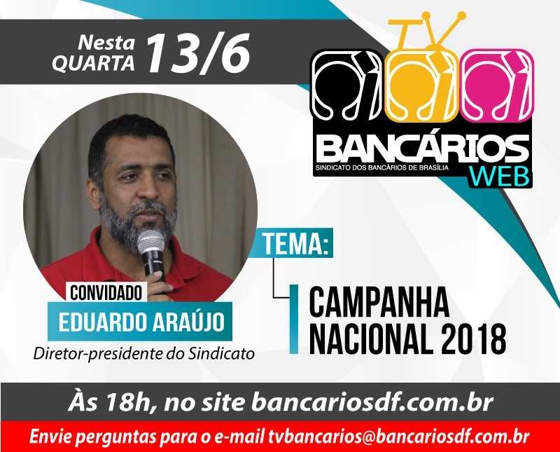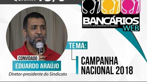 Depois dos encontros nacionais de bancos privados, congressos específicos do BB e da Caixa e da 20ª Conferência Nacional dos Bancários, a categoria se prepara para dar mais um passo na Campanha Nacional 2018. Nesta quarta-feira (13), o presidente do Sindicato Eduardo Araújo, participa da entrega da minuta à Fenaban e aos bancos públicos e, às 18h, será o convidado do programa TV Bancários Web.