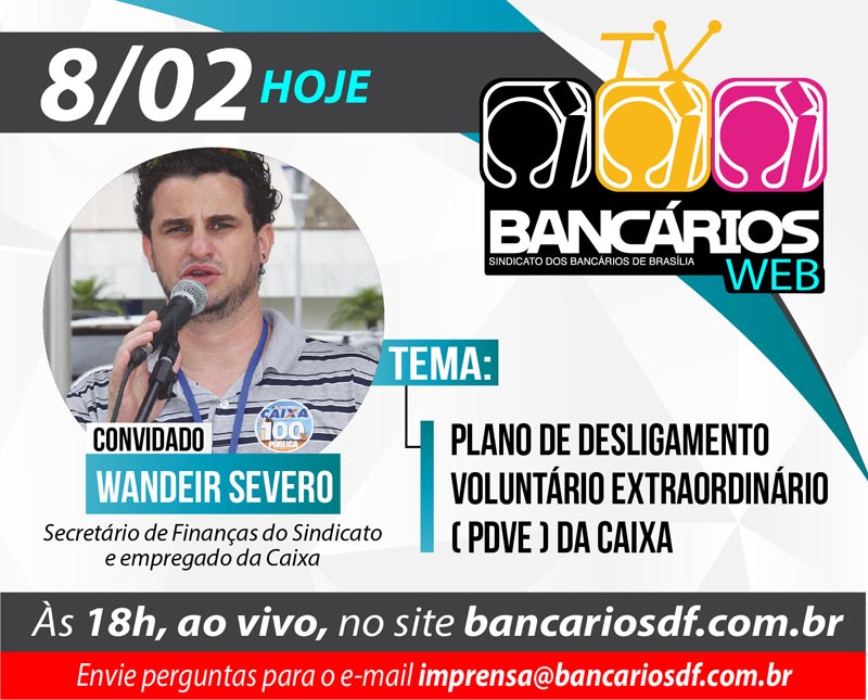 O Plano de Desligamento Voluntário (PDV) da Caixa é o tema da edição desta quarta-feira (8) do TV Bancários Web. O convidado do programa será o secretário de Finanças do Sindicato e empregado da Caixa, Wandeir Severo.