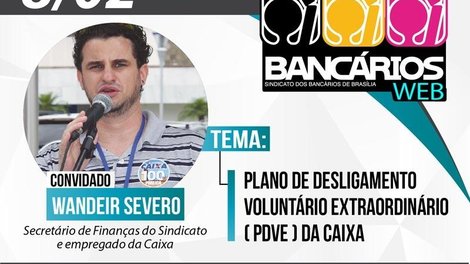 O Plano de Desligamento Voluntário (PDV) da Caixa é o tema da edição desta quarta-feira (8) do TV Bancários Web. O convidado do programa será o secretário de Finanças do Sindicato e empregado da Caixa, Wandeir Severo.