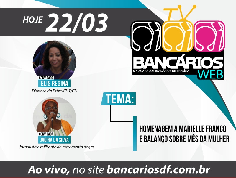 Nesta quinta-feira (22), a edição do TV Bancários Web presta homenagem à vereadora Marielle Franco, assassinada na última semana no Rio de Janeiro, e analisa o Mês da Mulher. Para o debate, o programa recebe a diretora da Federação dos Bancários do Centro Norte (Fetec-CUT/C N) Elis Regina e a jornalista e militante do movimento negro Jacira da Silva.