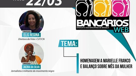 Nesta quinta-feira (22), a edição do TV Bancários Web presta homenagem à vereadora Marielle Franco, assassinada na última semana no Rio de Janeiro, e analisa o Mês da Mulher. Para o debate, o programa recebe a diretora da Federação dos Bancários do Centro Norte (Fetec-CUT/C N) Elis Regina e a jornalista e militante do movimento negro Jacira da Silva.