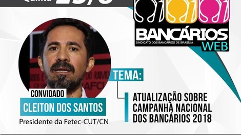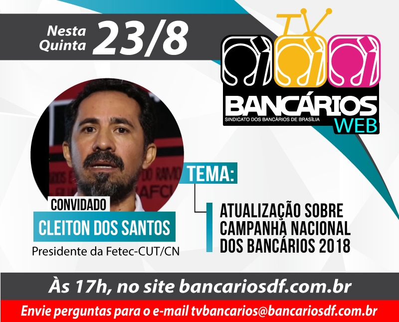Na edição desta quinta-feira (23), o TV Bancários Web entrevista o presidente da Federação dos Bancários do Centro Norte (Fetec-CUT/CN), Cleiton dos Santos, que atualiza a categoria bancária sobre a Campanha Nacional dos Bancários. O programa será transmitido pelas redes sociais do Sindicato a partir das 17h.