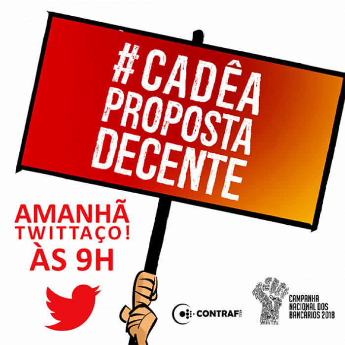 Os bancários de todo o Brasil realizam nesta sexta-feira (17), às 9h, um twittaço para cobrar da Federação Nacional dos Bancos (Fenaban) uma proposta global que garanta o emprego e os direitos conquistados pela categoria. A mesa de negociação terá início às 10h, na qual o Comando Nacional dos Bancários espera que seja apresentada uma proposta decente, prometida pelos banqueiros desde 1º de agosto.