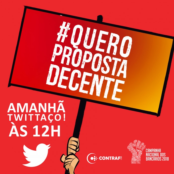 Os bancários de todo o Brasil realizam nesta terça-feira (21), às 12h, um twittaço para cobrar da Federação Nacional dos Bancos (Fenaban) uma proposta global que garanta o emprego e os direitos conquistados pela categoria. A mesa de negociação terá início às 14h, na qual o Comando Nacional dos Bancários espera que seja apresentada uma proposta decente, prometida pelos banqueiros desde 1º de agosto.