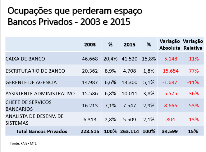 “Percebemos que o número de ocupações de gerentes teve aumento. Um reflexo direto do uso das novas tecnologias. O banco quer que o gerente trabalhe em ritmo mais acelerado, que leva a um maior adoecimento da categoria. Para não perder o cliente e o emprego, o funcionário trabalha o tempo todo, até fora do horário de expediente”, reforça a economista.