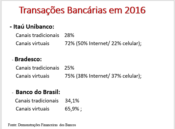 A economista Vivian Machado também apresentou o quadro com as transações bancárias em 2016. No Itaú e no Bradesco, as oprações por canais virtuais já são mais de 70%.