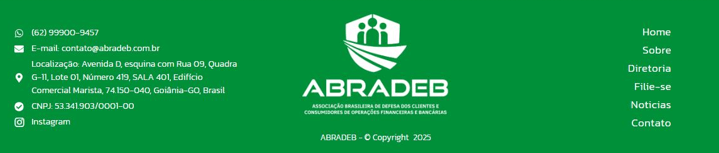 Com ata de fundação datada de 25 de julho de 2023, exatamente dois meses antes da ata da ABDAGRO, a ABRADEB foi registrada em cartório no dia 30/11/2023. No dia 18/12/2024, novamente demonstrando a pressa em fazer jus à regra da pré-constituição de associações proponentes de ações civis públicas, a ABRADEB promoveu a ação civil pública 1059901-47.2024.4.01.3500 contra a Caixa Econômica Federal, com valor da causa fixado em R$ 1,3 bilhão de reais.