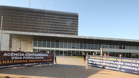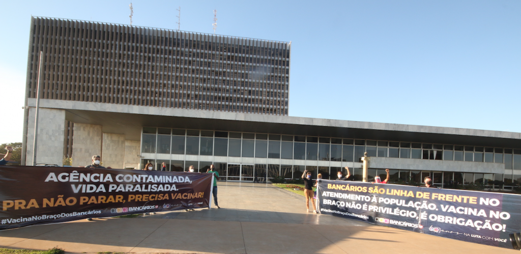 Conforme deliberado em assembleia geral da categoria na quinta-feira (1º), o Sindicato percorreu, na manhã desta segunda-feira (5), agências bancárias do SCS, Asa Sul e Norte, que tiveram suas atividades paralisadas em protesto contra o recuo do governador do Distrito Federal (GDF), Ibaneis Rocha, na priorização dos bancários no plano de imunização contra a covid-19 e para pressionar pela garantia do direito à vacina no braço dos trabalhadores. Os bancários também se mobilizaram pelas redes sociais, usando as hashtags #VacinaLogoIbaneis e #GovernadorIbaneisCumpraAPalavra.