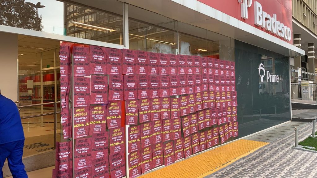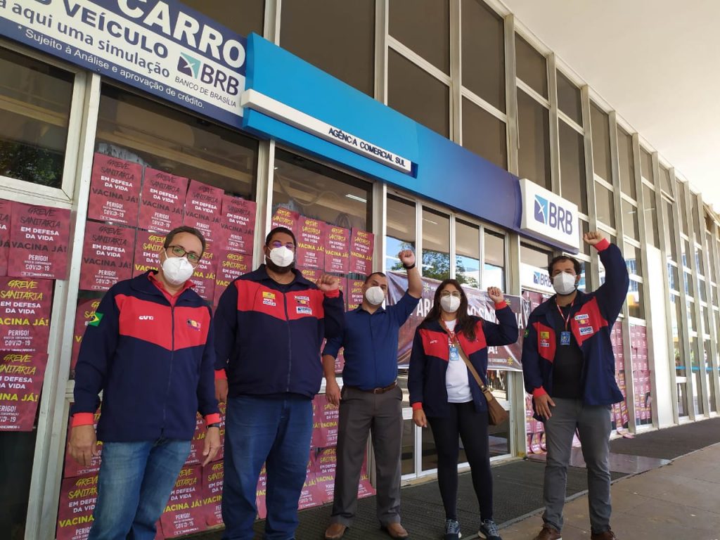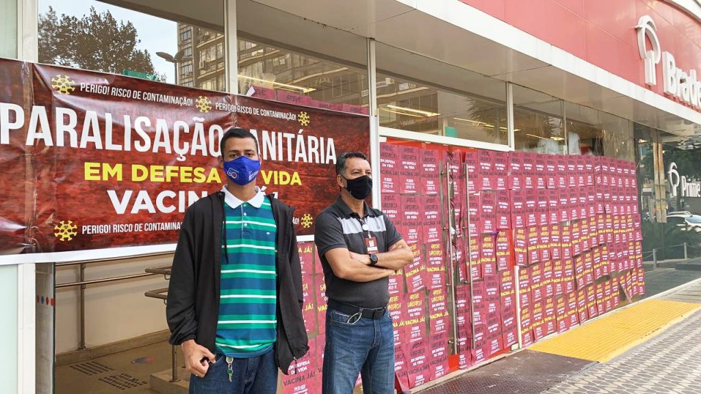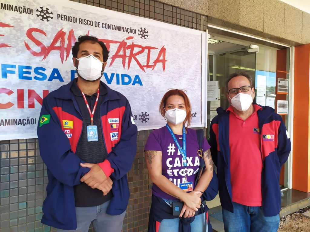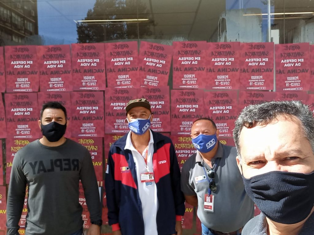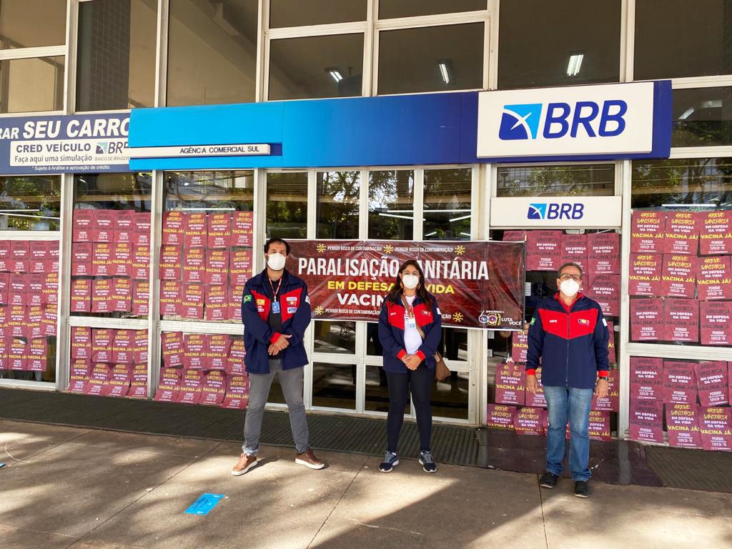 Durante a madrugada, o Sindicato colou cartazes em dezenas de agências da cidade, em que esclarece a importância de priorizar a imunização dos trabalhadores e cobrando um posicionamento do governo do DF.