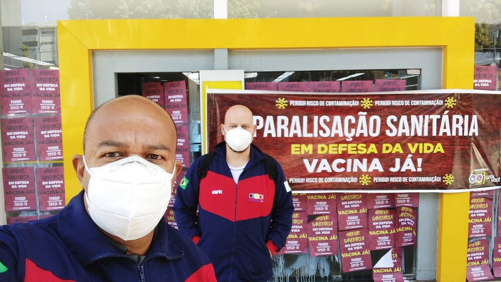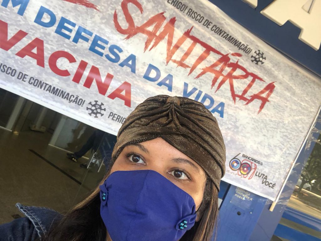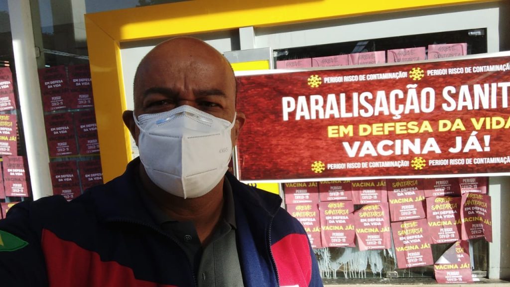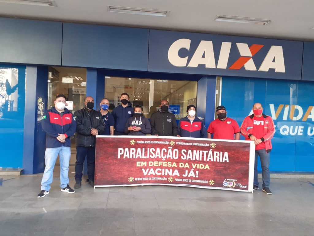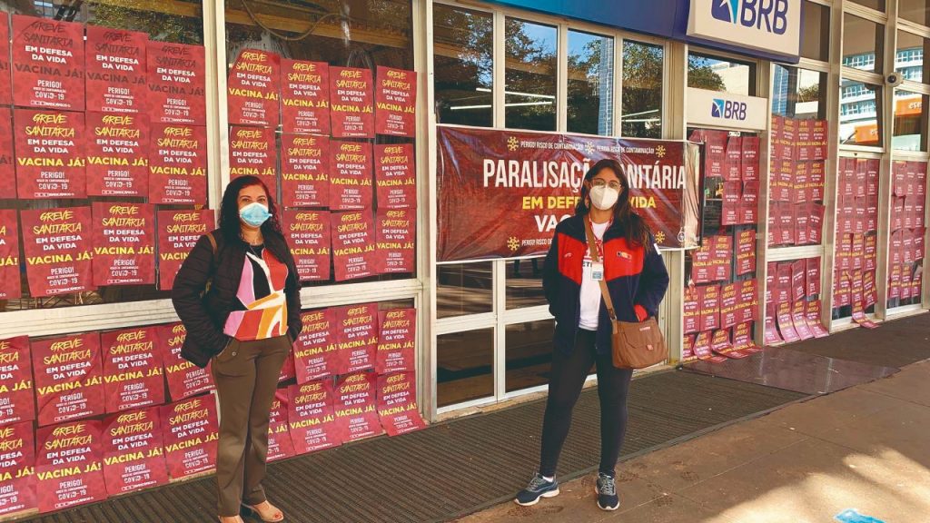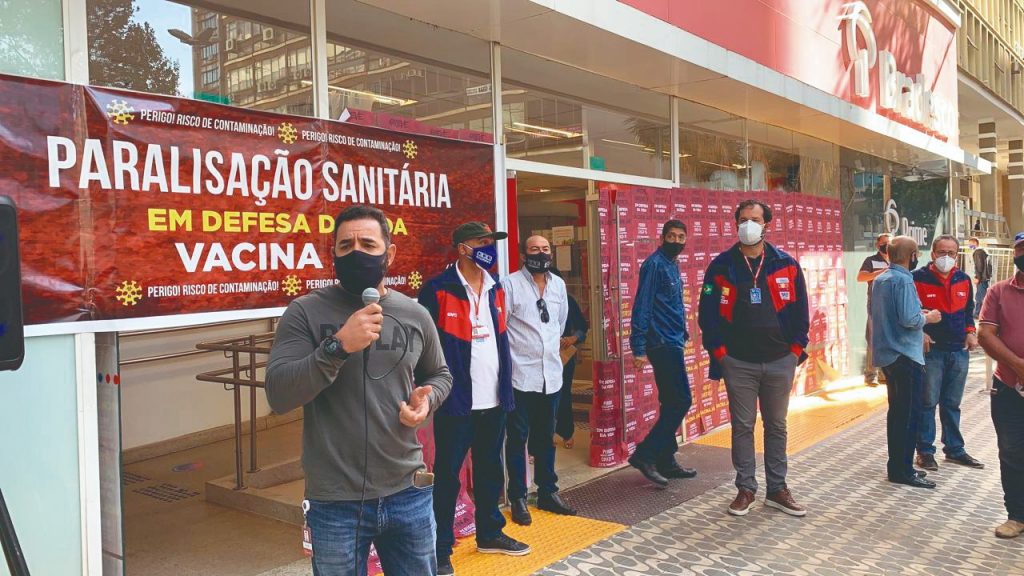 Durante a madrugada, o Sindicato colou cartazes em dezenas de agências da cidade, em que esclarece a importância de priorizar a imunização dos trabalhadores e cobrando um posicionamento do governo do DF.