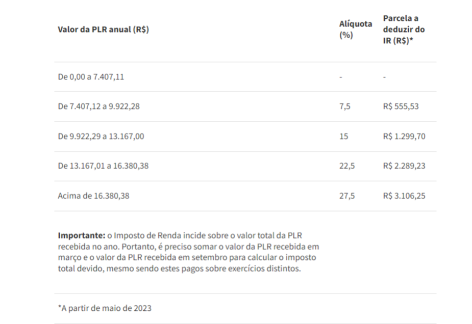 O governo Lula reajustou, em maio deste ano, a tabela do Imposto de Renda sobre a PLR de 2023. A alteração foi feita na faixa de isenção da tabela, que passou dos R$ 6.677,55 para os atuais R$ 7.407,11, um reajuste de 10,93%, ou seja, ampliou-se a faixa de isenção da PLR. A tabela do IR na PLR não sofria alteração desde 2015.
