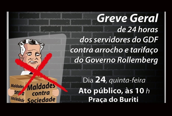 O funcionalismo Público do Distrito Federal vai fazer greve geral de 24 horas nesta quinta-feira (24) e realizar ato público, às 10h, em frente ao Palácio do Buriti. A paralisação é resposta à onda de ataques aos direitos e remuneração dos servidores, à população e à própria legislação vigente desencadeada pelo governo Rollemberg.