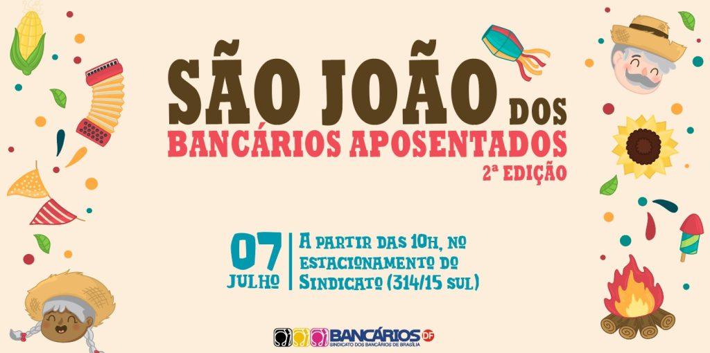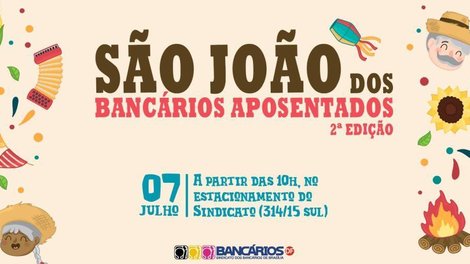 Bancárias e bancários, se preparem que a 2ª edição do São João dos Bancários Aposentados está chegando, com a promessa de repetir o sucesso do ano passado. Coloque seu traje típico e venha se divertir na melhor festança da roça, no dia 7 de julho, das 10h às 20h, no estacionamento da sede do Sindicato (EQS 314/315). A entrada é gratuita e aberta à comunidade.