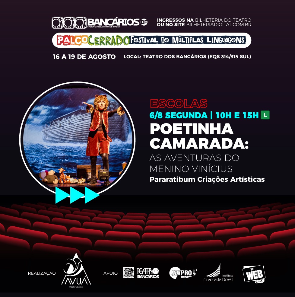 Para abrir a programação de agosto, o festival recebe excepcionalmente, nesta segunda-feira (6), o espetáculo ‘Poetinha Camarada: As Aventuras do Menino Vinícius’, do grupo Pararatibum Criações Artísticas. A peça infantil, que será apresentada exclusivamente para alunos de escolas públicas, foi criada a partir da obra Arca de Noé, de Vinícius de Moraes, e é uma releitura integrada por personagens do clássico, no universo infantil do artista.