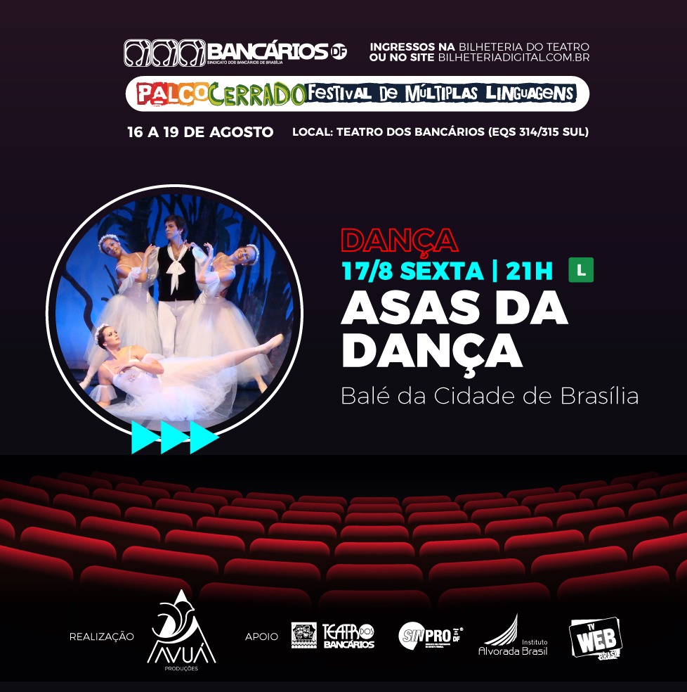 Dia 17, sexta-feira, às 21h, tem espetáculo 'Asas da Dança' com a companhia Balé da Cidade de Brasília. O grupo traz em sua apresentação vários trechos de balés consagrados e coreografias contemporâneas premiadas, sendo executadas por jovens talentos do Distrito Federal.