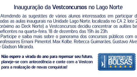 Desconto de 18% nos produtos e serviços (cursos presenciais, livros e apostilas) oferecidos pela Vestcon editora. O desconto é somente válido para aquisições nos endereços da loja localizada no SEPN, quadra 509, conjunto B, número 10, Ed. Contag, e da sede Vestconcursos, no SGAN 906, Módulo A, Asa Norte.