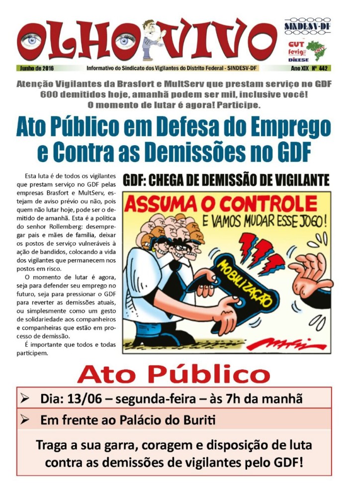 O ato público em Defesa do Emprego e Contra Demissões no GDF acontece a partir das 7h, de segunda-feira, em frente ao Palácio do Buriti e são esperados cerca de três mil vigilantes.