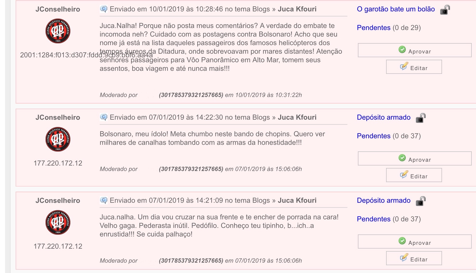 "Juca-nalha. Um dia vou cruzar na sua frente e te encher de porrada na cara! Velho gaga. Pederasta inútil. Pedófilo (…) Se cuida palhaço!", escreveu Joly Júnior, que afirmou ser ex-militar nas mensagens e defensor de Bolsonaro. “Bolsonaro, meu ídolo! Meta chumbo nesse bando de chopins. Quero ver milhares de canalhas tombando com as armas da honestidade”, disse, em outro comentário do blog.