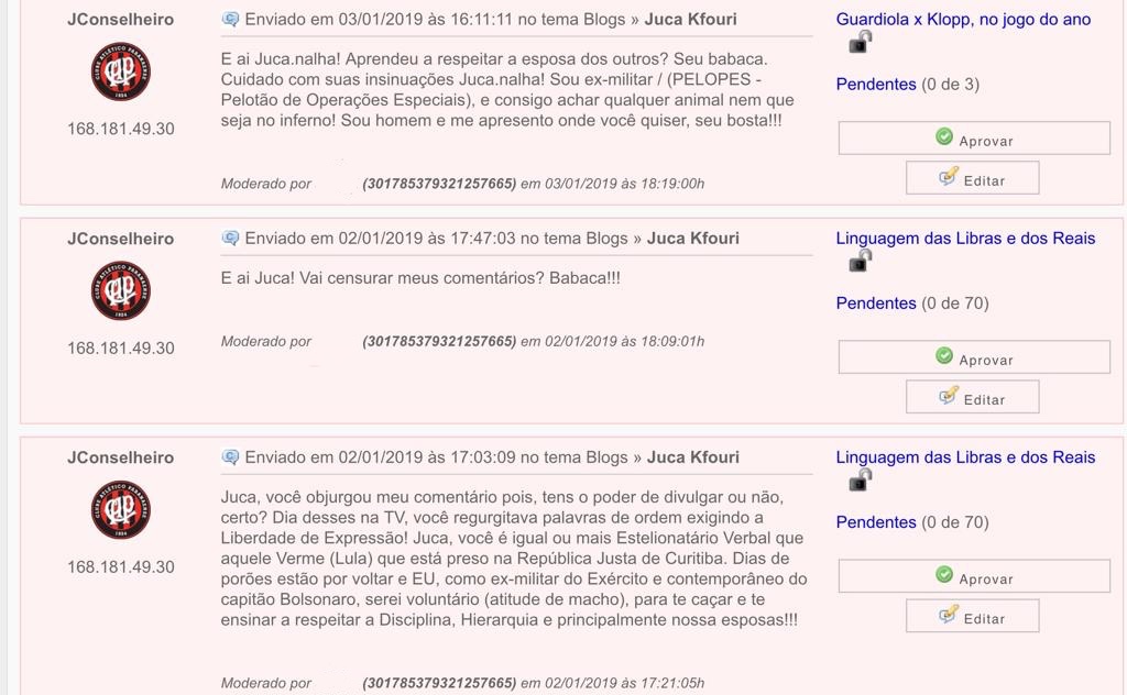 O jornalista esportivo Juca Kfouri, autor do Blog do Juca Kfouri, hospedado no site UOL, recebe cotidianamente ameaças e xingamentos. Na última segunda-feira (14), o profissional entrou com representação no Ministério Público de São Paulo contra o corretor de imóveis José Emílio Joly Júnior, que lhe ameaçou por diversas vezes.
