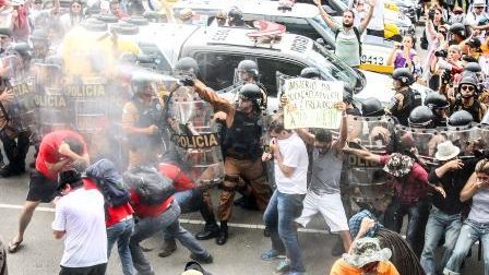 Todavia, o pior ainda estava por vir. Por volta das 11h os professores e funcionários de escola foram surpreendidos com o ataque da Polícia Militar do governo Beto Richa (PSDB). Foram utilizadas bombas de gás lacrimogênio, sprays de pimenta, canhões de água e tiros com balas de borracha.