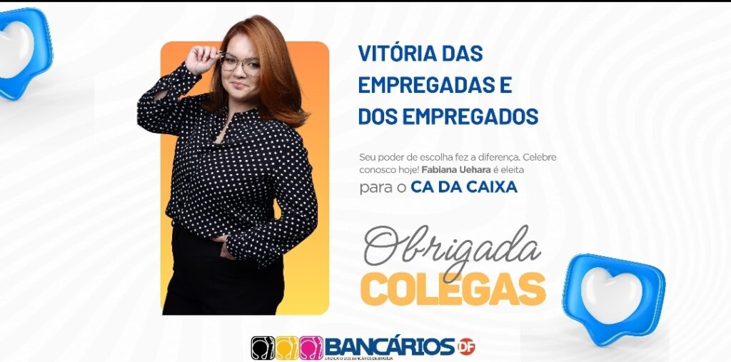 “Valeeeeu, meu povo! Obrigada pelo voto de confiança depositado em mim. O mandato será NOSSO, e reafirmo o compromisso de continuar defendendo a Caixa 100% pública, forte e atuante na diminuição da desigualdade no nosso país, o respeito e a valorização dos empregados”, comemora a nova conselheira de Administração da Caixa eleita, Fabi Uehara.