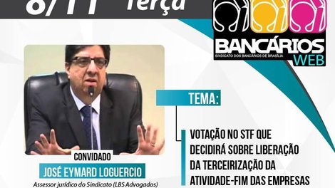 Diante de mais um grande ataque aos direitos das trabalhadoras e trabalhadores, o TV Bancários Web desta terça (8) debate a votação no Supremo Tribunal Federal (STF) que decidirá sobre a liberação da terceirização na atividade-fim das empresas. Para falar sobre o tema, o programa recebe o advogado José Eymard Loguercio, assessor jurídico do Sindicato (LBS Advogados).