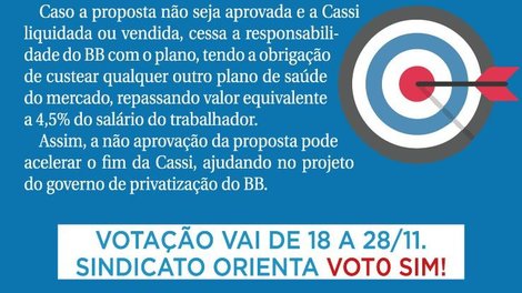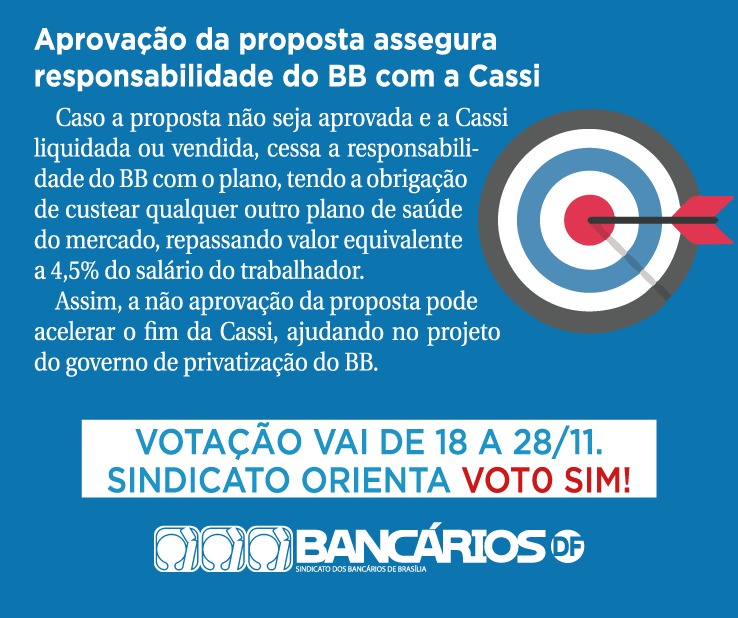 Entre os dias 18 e 28 de novembro, o Corpo Social da Caixa de Assistência dos Funcionários do Banco do Brasil (Cassi) será consultado sobre a proposta de sustentabilidade da entidade elaborada e aprovada pela direção do plano. O Sindicato dos Bancários de Brasília orienta o voto SIM na proposta.