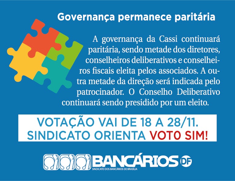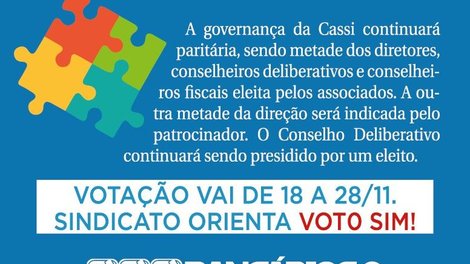 Entre os dias 18 e 28 de novembro, o Corpo Social da Caixa de Assistência dos Funcionários do Banco do Brasil (Cassi) será consultado sobre a proposta de sustentabilidade da entidade elaborada e aprovada pela direção do plano. O Sindicato dos Bancários de Brasília orienta o voto SIM na proposta.