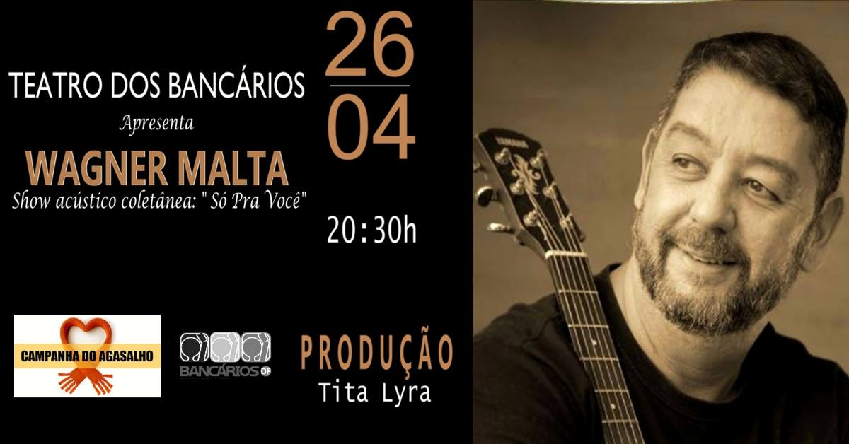 O cantor e compositor brasiliense mas residente em João Pessoa, Wagner Malta apresenta no próximo dia 26 de abril às 20h30, no teatro dos bancários, uma coletânea de músicas de grande expressão, a maioria inéditas. O músico sobe ao palco ladeando instrumentistas de grande peso tais como Manassés de Sousa na viola de 12 cordas, Cláudio Alencar no violão de aço e nylon e viola de 12 cordas, Dennes Sousa na flauta, violão e baixo, Rodrigo Zolet no Acordeon e Johnny Rodergas na percussão.